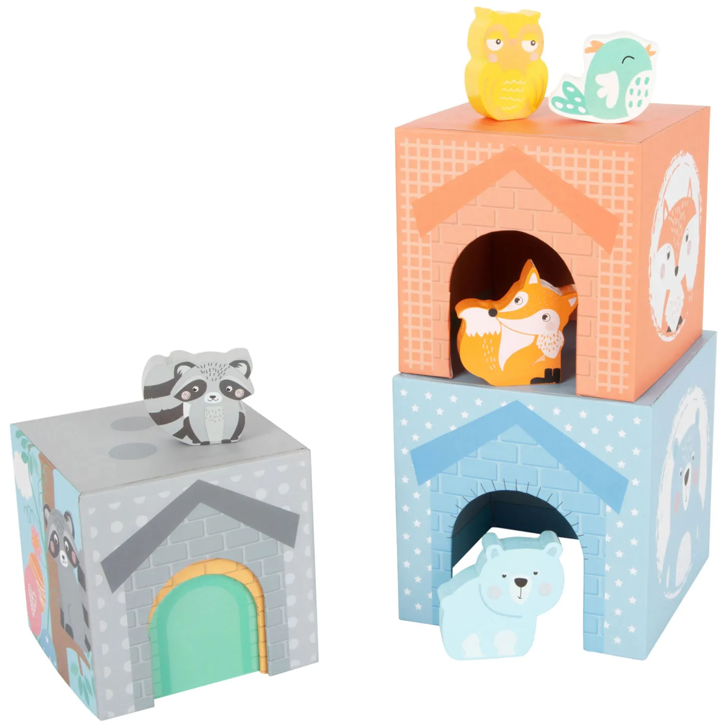 Afmetingen: grootste kubus ca. 13 x 13 x 13 cm, vos ca. 6 x 1,5 x 6 cm. Geschikt voor kinderen vanaf 12 maanden oud.