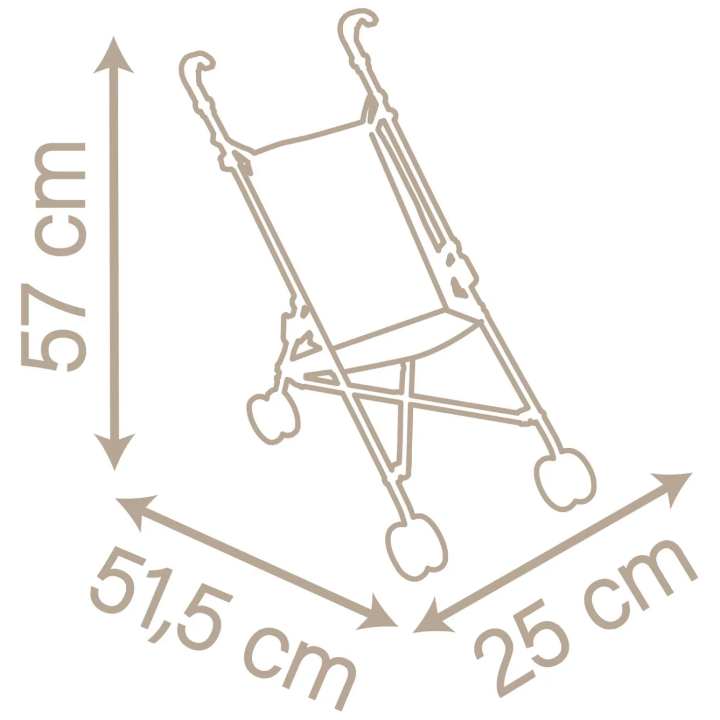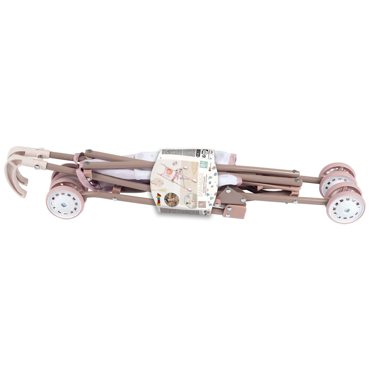 Het stevige metalen en kunststof frame heeft twee handige handgrepen en vier wielen. De zitting is van stof en heeft een lief pastelkleurig printje. Deze poppenwagen heeft een buggymodel.