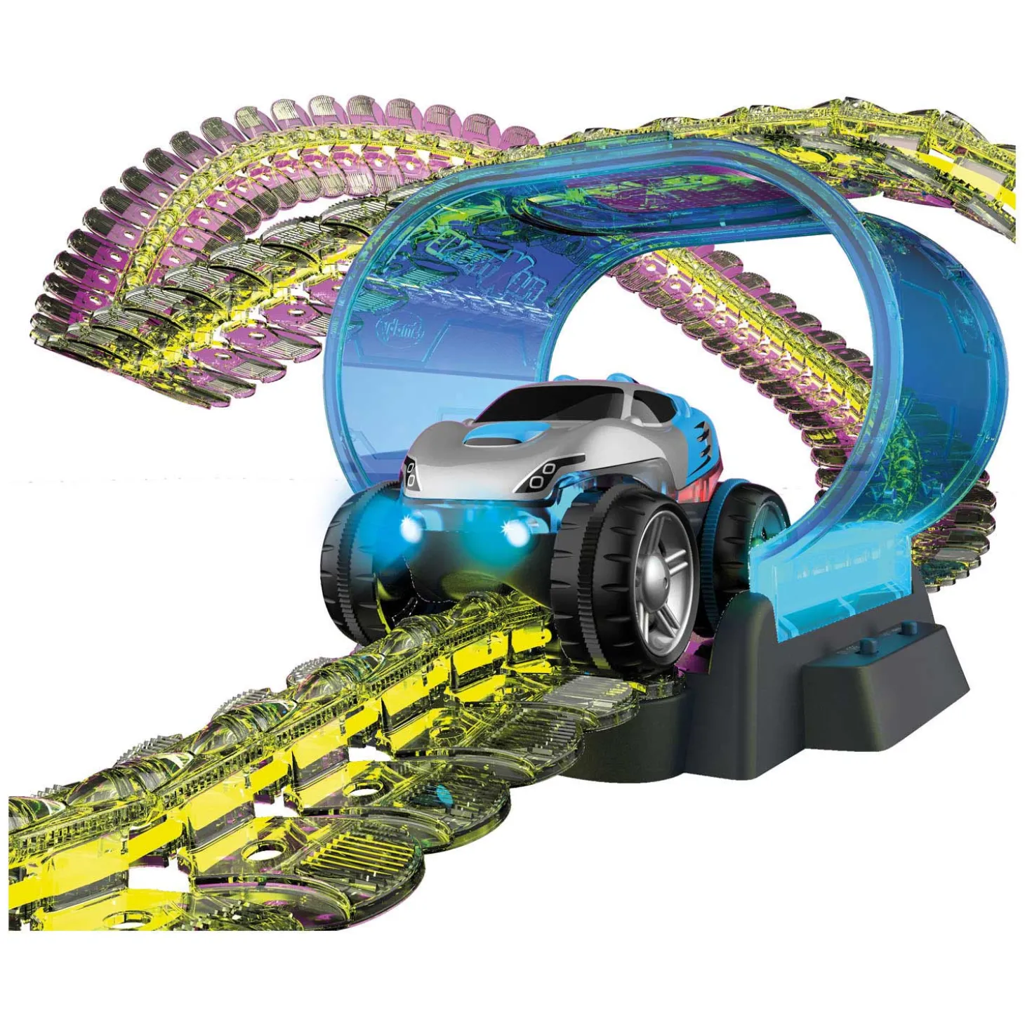 Maak een looping, leg de baan op z’n kop of steek ‘m zo over van de tafel naar de stoel. Niks is te gek met de Smoby FleXtreme Neon Set! Deze 112-delige raceset bestaat uit maar liefst 2,6 meter aan baan met lichtvezels, een verlichte tunnel en elektrische auto met verlichting. Er zijn verschillende standen en maar liefst 7 kleuropties voor het verlichten van deze vette raceset. In het donker zie je een waar lichtspektakel als de auto over de baan racet.