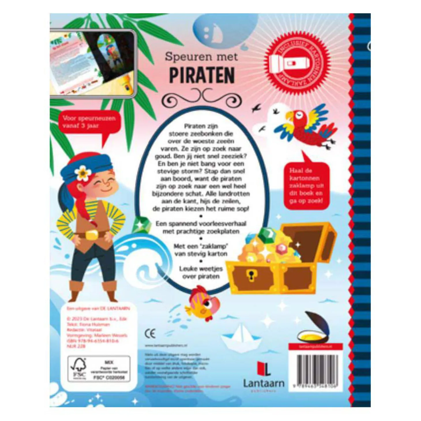 Het boek begint met leuke weetjes en feitjes over piraten. Hier kom je ook de kartonnen zaklamp tegen. Deze zaklamp heb je nodig voor de pagina’s die volgen. In het verhaal staan namelijk gekleurde woorden, die je op de rechterpagina kunt zoeken. Maar dat lukt alleen als je de zaklamp gebruikt! Schuif ‘m onder de zwarte pagina en je ziet dat er een lichtbundel ontstaat, waarmee je kunt zien wat de piraten allemaal beleven. Bekijk je ook de andere titels in deze serie?