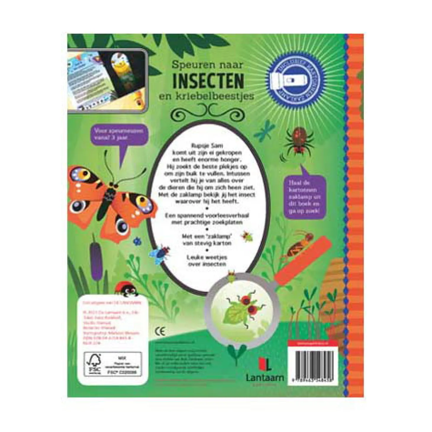 Het boek begint met leuke weetjes en feitjes over insecten. Hier kom je ook de kartonnen zaklamp tegen. Deze zaklamp heb je nodig voor de pagina’s die volgen. In het verhaal staan namelijk gekleurde woorden, die je op de rechterpagina kunt zoeken. Maar dat lukt alleen als je de zaklamp gebruikt! Schuif ‘m onder de zwarte pagina en je ziet dat er een lichtbundel ontstaat, waarmee je kunt zien wat Sam allemaal tegenkomt. Bekijk je ook de andere titels in deze serie?