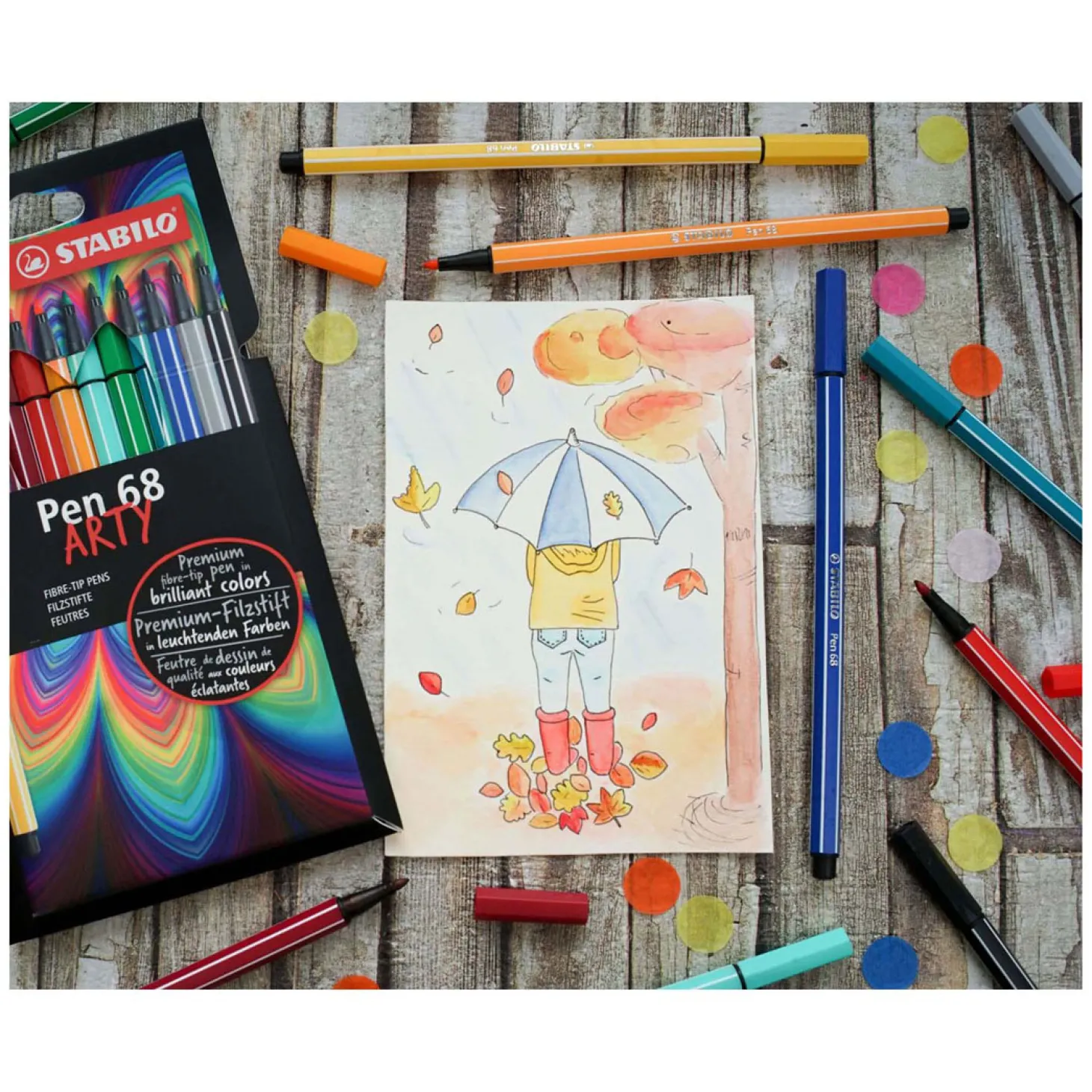 De STABILO Pen 68 viltstiften zijn viltstiften van de allerhoogste kwaliteit en bieden oneindig veel kleurmogelijkheden. De punt is 1 mm dik voor krachtige lijnen en het inkleuren van vlakken. De robuuste punt zorgt voor een gelijkmatige inktafgifte. De viltstift kan 24 uur zonder dop zonder dat de punt uitdroogt. De kleuren zijn intens en zeer goed dekkend.