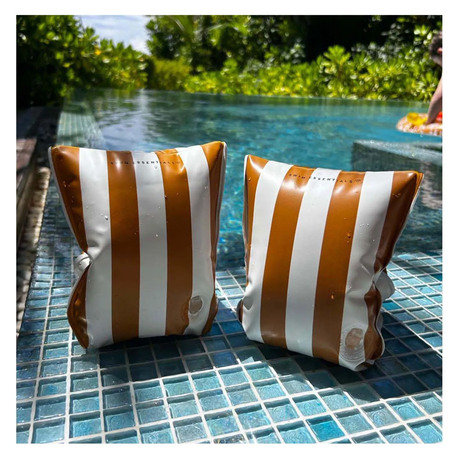 De bruine en witte strepen geven de zwembandjes een frisse en zonnige uitstraling, perfect voor de zonnige zomerdagen. Daarnaast zorgt het ontwerp ervoor dat de zwembandjes opvallen. Zo gaat je kleintje veilig en opvallend het water in. Dat is natuurlijk wat je wilt als ouder.