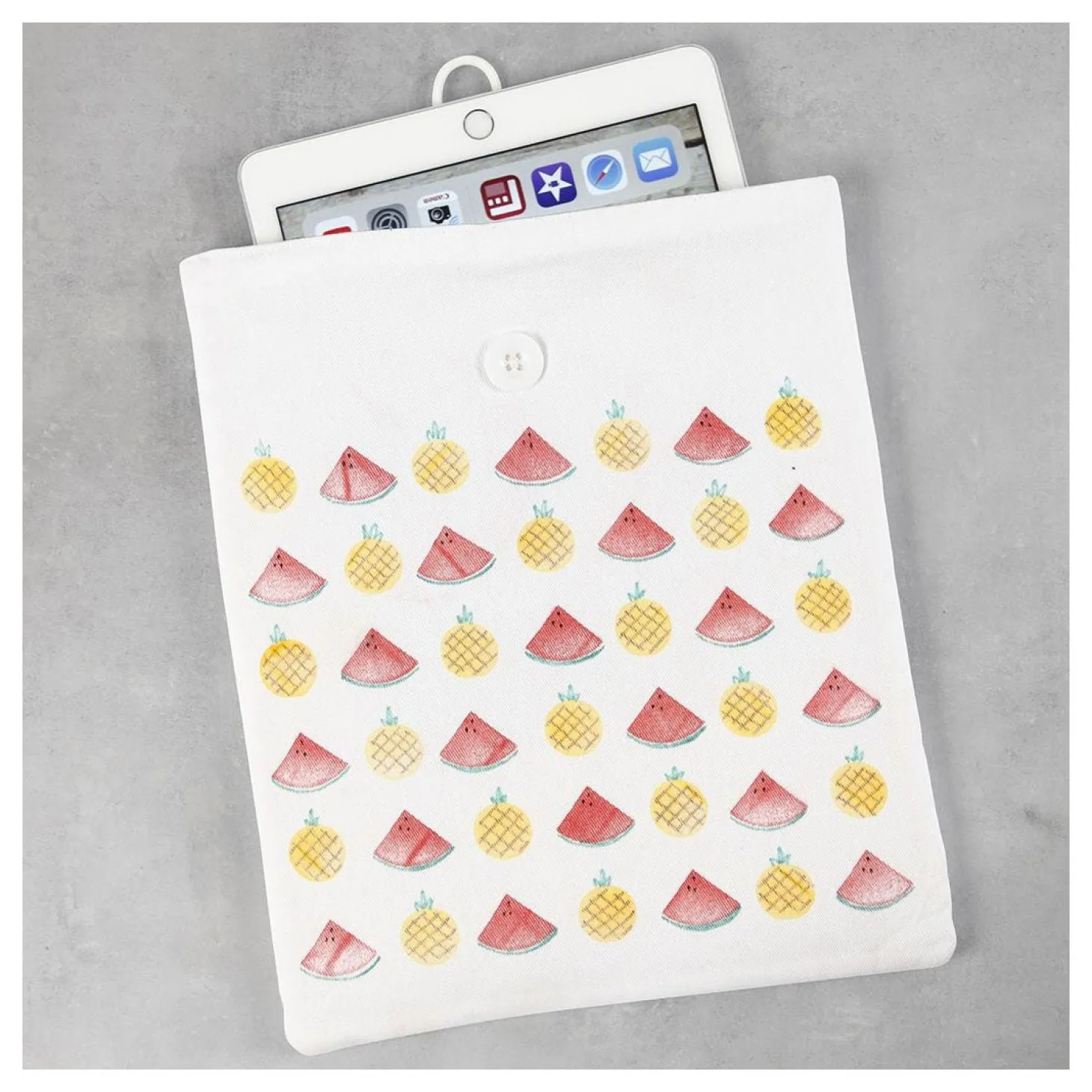 Praktische hoes voor tablets en iPads van 100% katoen. De hoes is gevoerd en heeft een knoopsluiting aan de bovenkant