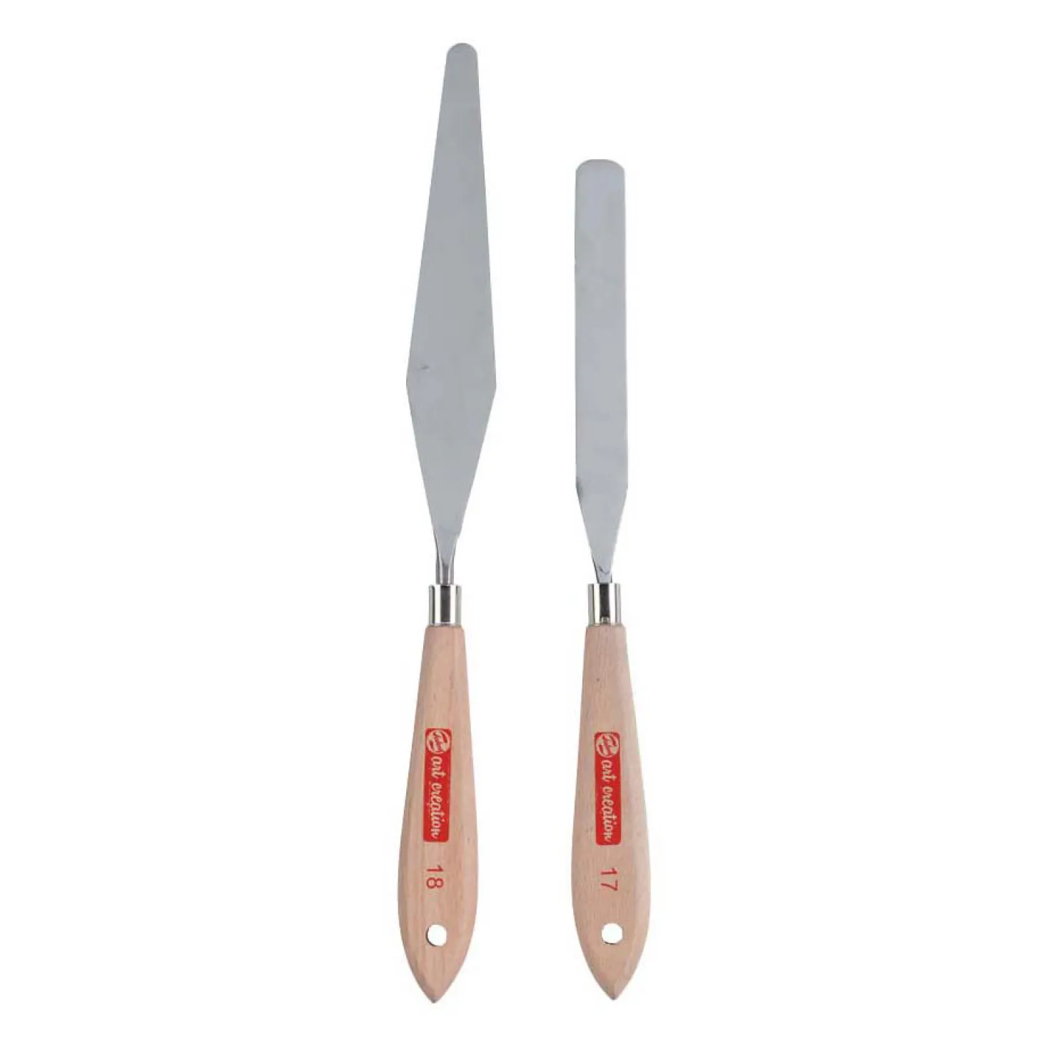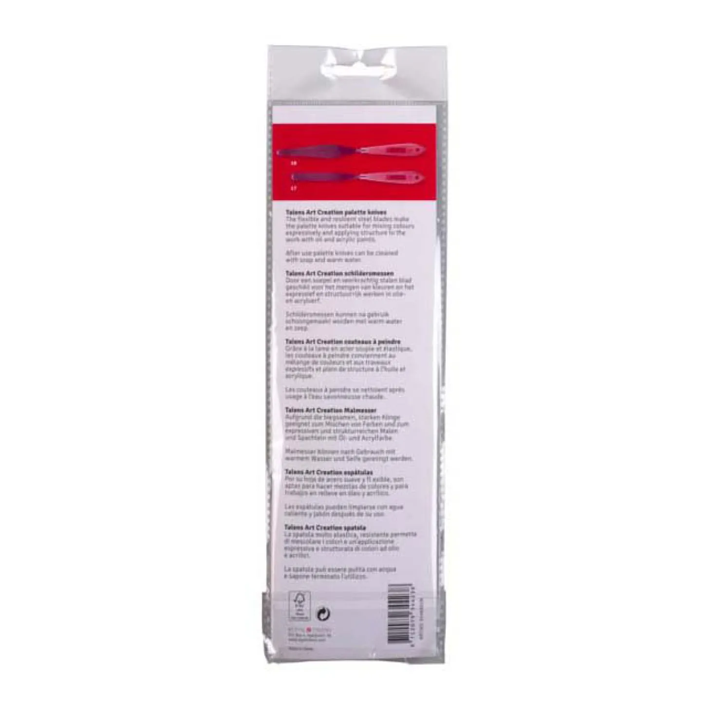 Een set met 2 metalen paletmessen. Dankzij de lange, rechte vorm zijn deze messen ideaal voor het voorbereiden en mengen van kleuren en om het oppervlak van je palet schoon te maken. Ook geschikt voor het creƫren van expressief en gestructureerd werk met olie- en acrylverf.