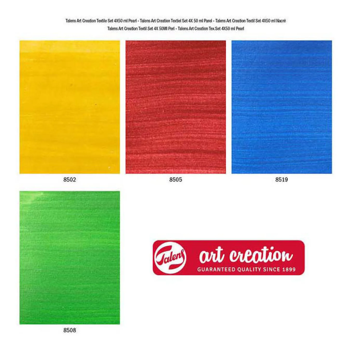 Inhoud: 4x50ml (8502 Parelgeel – 8505 Parelrood – 8519 Parelblauw – 8508 Parelgroen).