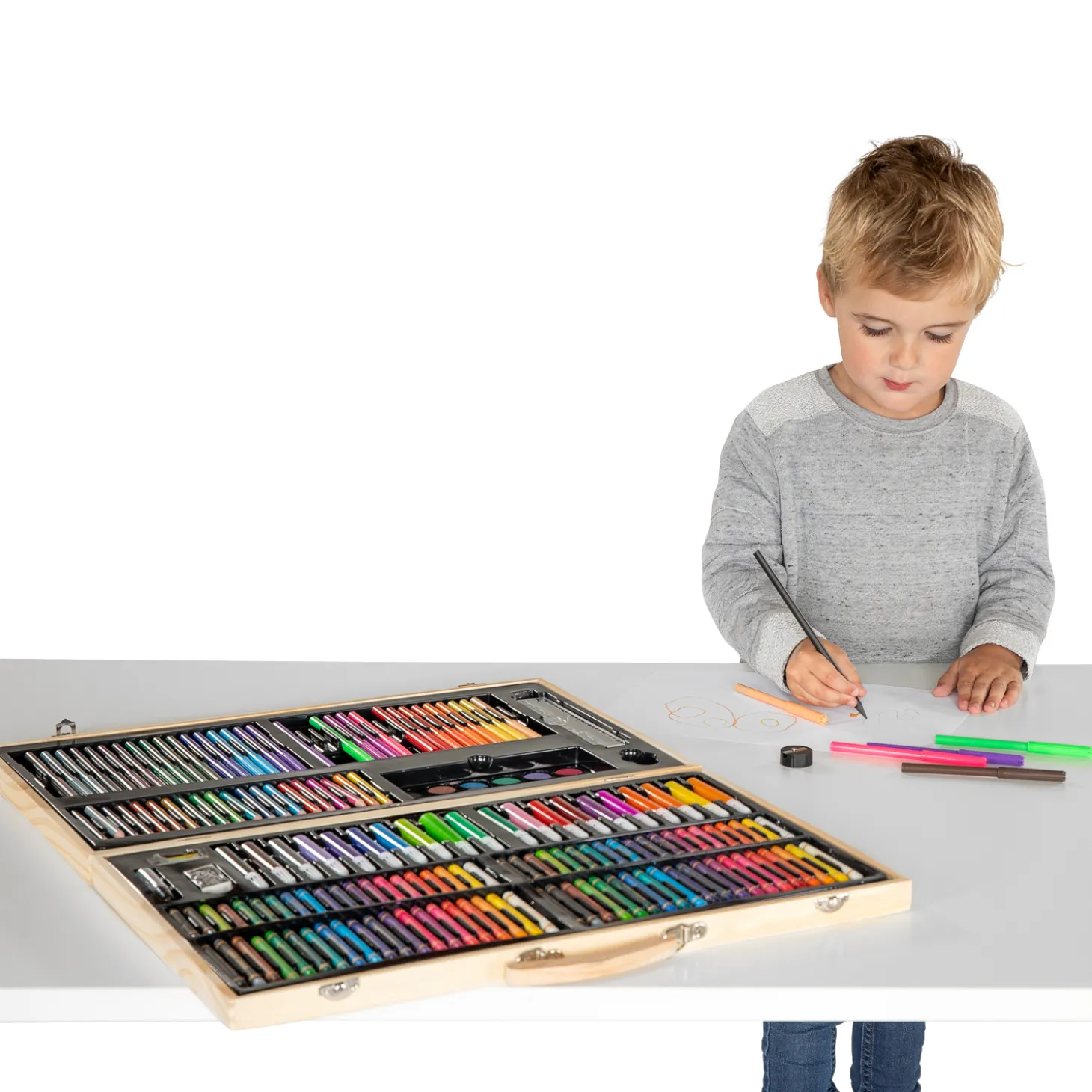 Naast de tekenmaterialen vind je in de koffer ook handige extra’s zoals een puntenslijper, liniaal, gum en paperclips. Alles ligt overzichtelijk bij elkaar, waardoor kinderen meteen aan de slag kunnen met hun mooiste kunstwerken.