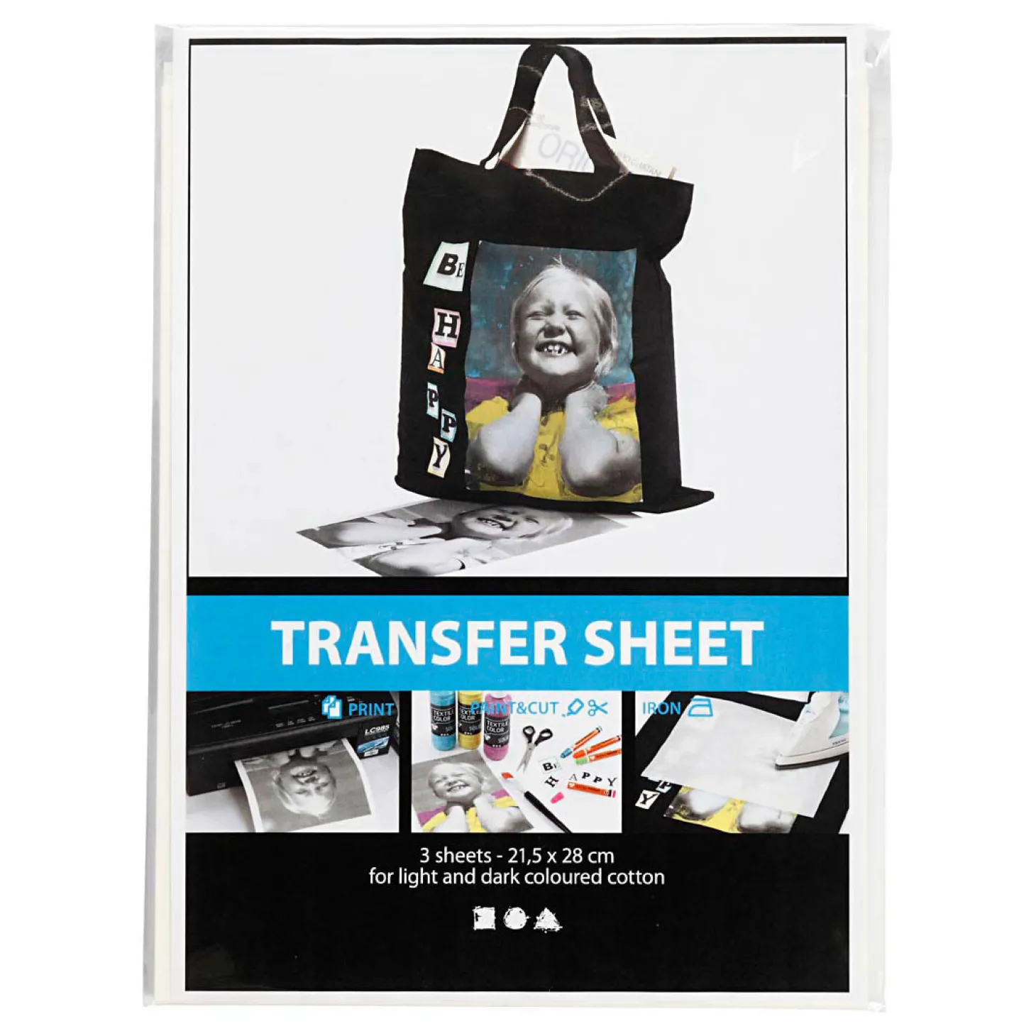 Speciale vellen met een rubberachtig oppervlak die kunnen worden versierd met textielverf, textielstiften of bedrukt met behulp van een inkjetprinter of een laserprinter. Het vel kan met een schaar worden doorgeknipt. Leg het motief met de voorkant naar boven op de stof, leg er een stuk bakpapier overheen en strijk op een vlakke ondergrond over het motief. Houd er rekening mee dat bij gebruik van transfer vellen voor lichte textiel (207010) het motief in plaats daarvan naar beneden moet zijn gericht en het papier aan de achterkant van het vel helemaal aan het uiteinde moet worden verwijderd.