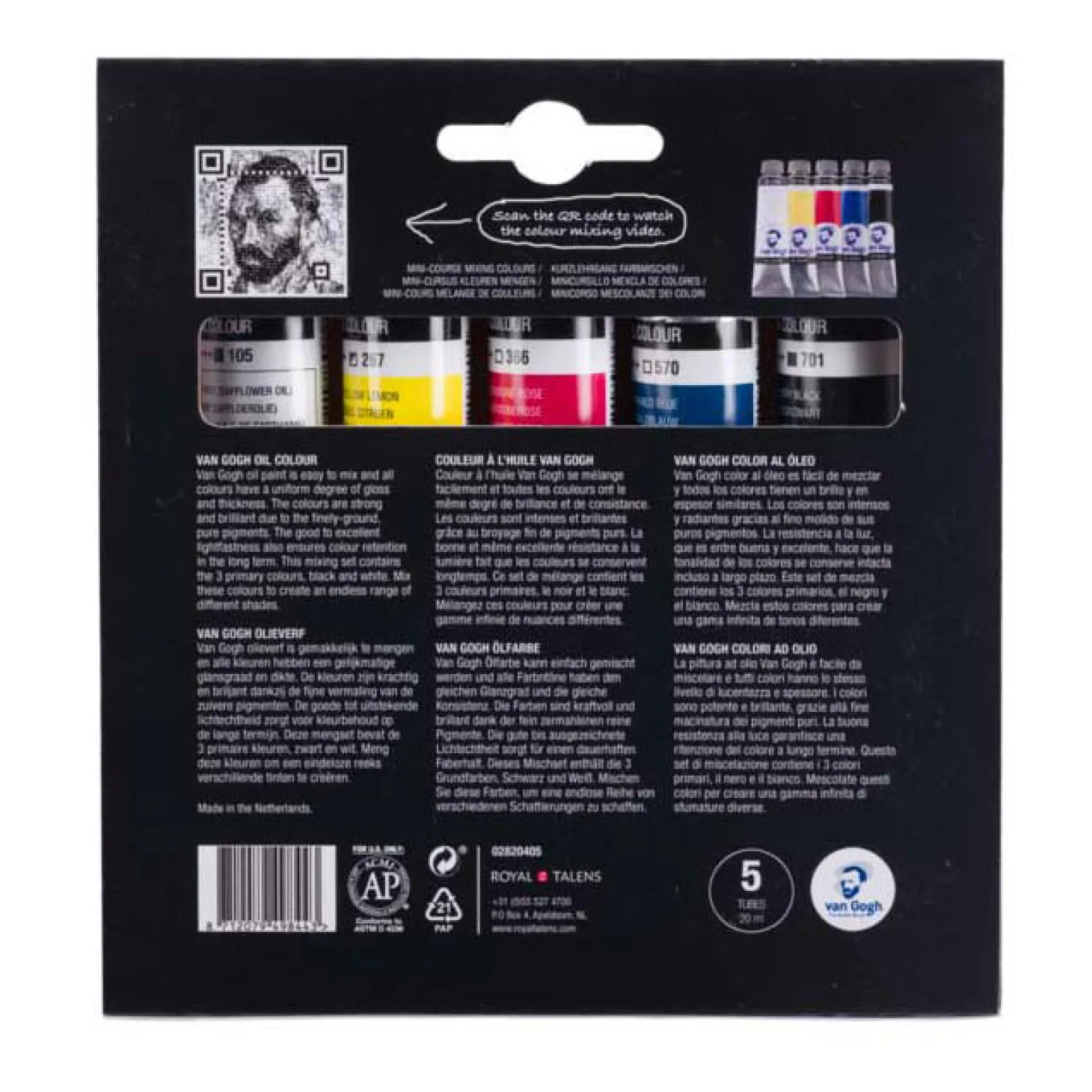 Deze primaire mengset bevat 5 tubes olieverf in de 3 primaire kleuren, zwart en wit. Meng deze kleuren om een eindeloze reeks verschillende tinten te creƫren. De set bevat ook een brochure met informatie over het mengen van kleuren en een QR-code die naar onze website leidt voor aanvullende informatie en een gedetailleerde video.