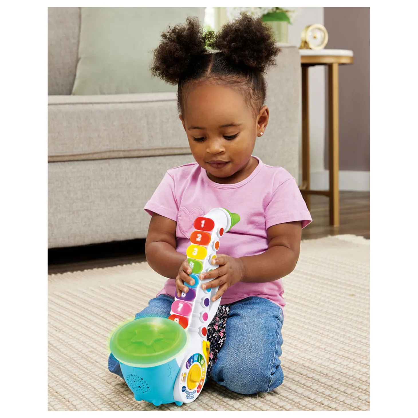 Word een echte muzikant! Leer stap voor stap saxofoon spelen door de knipperende toetsen te volgen of blaas op het mondstuk om vrolijke geluiden te horen. Kies uit één van de 9 speelstanden om muziek te maken en kennis te maken met kleuren en cijfers.