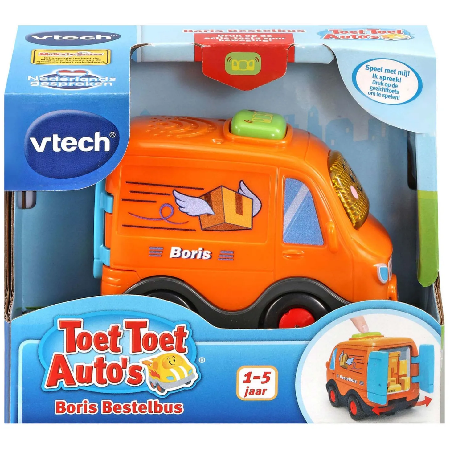 Verzamel alle voertuigen uit de VTech Toet Toet Auto’s collectie! Druk op de knipperende gezicht-toets om geluidseffecten, vrolijke zinnetjes en gezongen liedjes te horen. Druk op de actie-toets om de deuren te openen en grappige geluidjes te horen. Kom en bezorg de bestellingen met Boris Bestelbus!