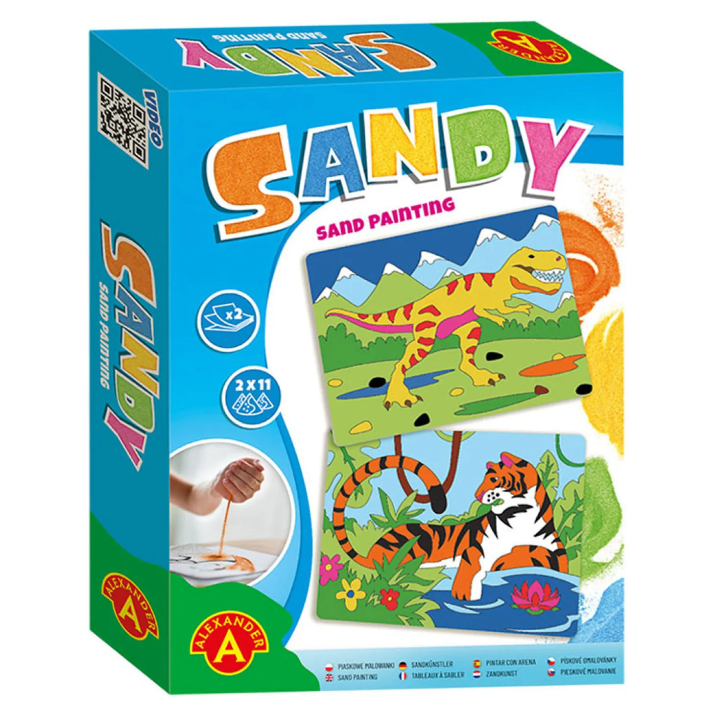Door de uitgesneden elementen één voor één te onthullen, komen er plakkerige oppervlaktes tevoorschijn die stuk voor stuk met verschillende kleuren zand bestrooid kunnen worden tot een mooie zandschilderij.