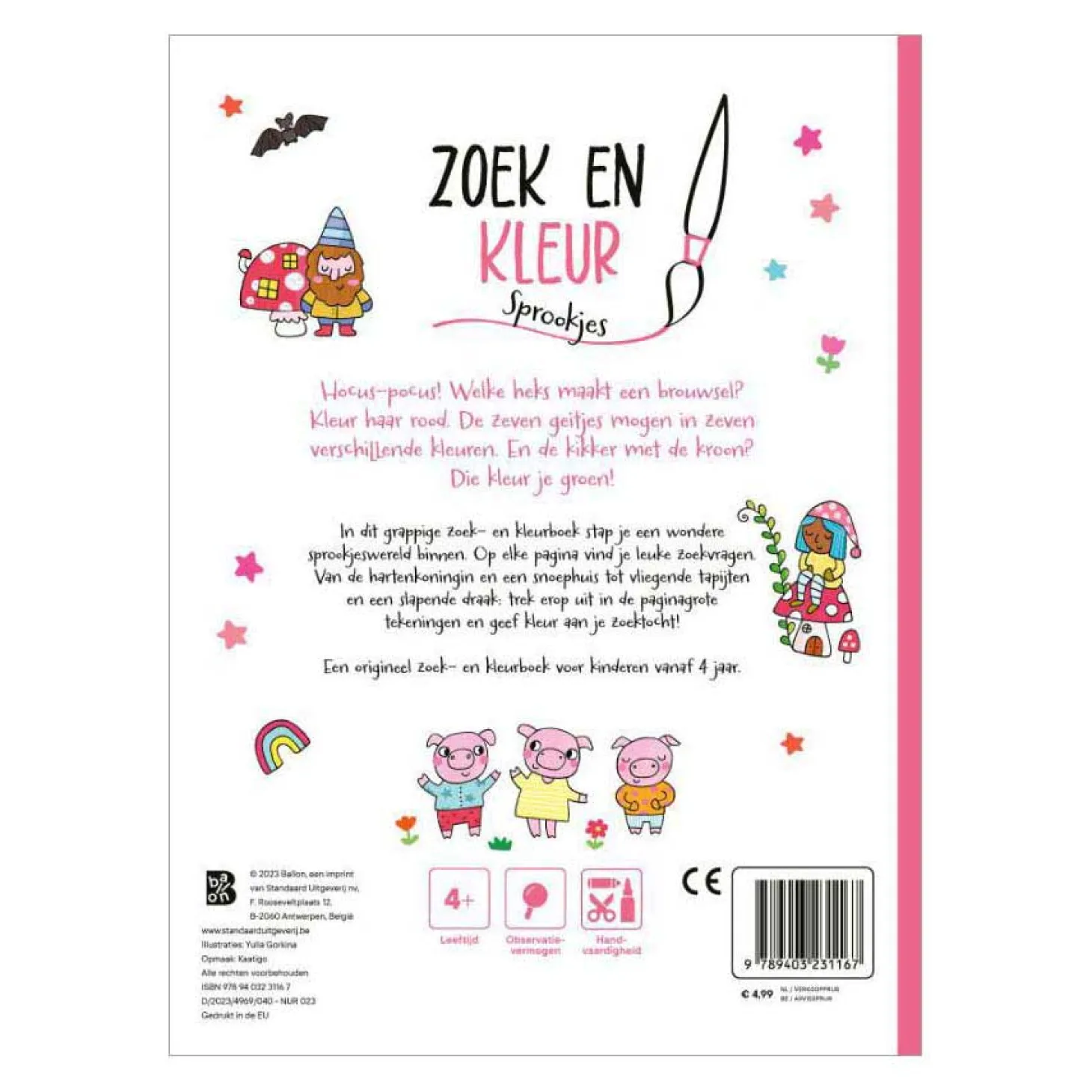 In dit grappige zoek- en kleurboek stap je een wondere sprookjeswereld binnen. Op elke pagina vind je leuke zoekvragen. Van de hartenkoningin en een snoephuis tot vliegende tapijten en een slapende draak: trek erop uit in de paginagrote tekeningen en geef kleur aan je zoektocht!